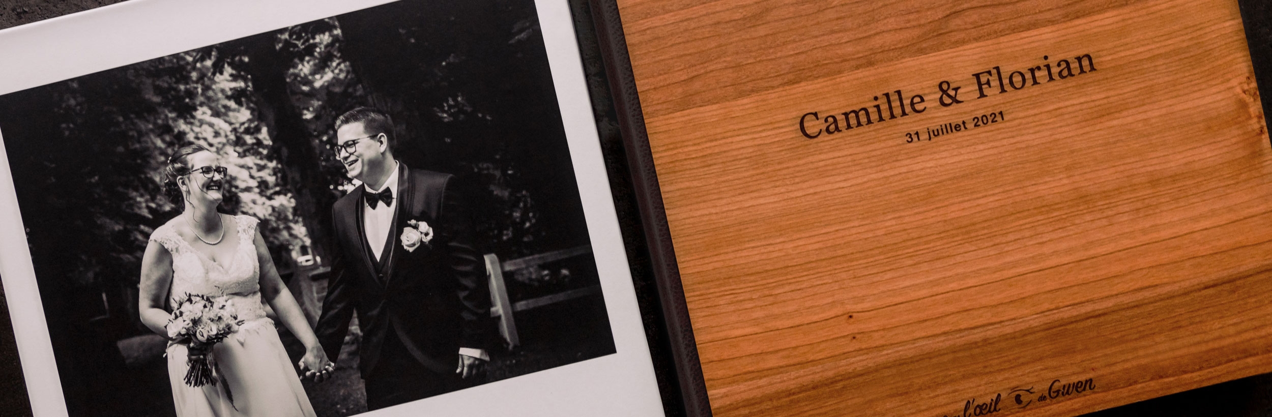 Je confie l'impression à un atelier français, qui réalise un façonnage artisanal et utilise un procédé de véritable tirage photo professionnel, pour un rendu des photographies de très haute qualité et qui dure dans le temps. Les albums sont composés d’une couverture cartonnée rigide (2 finitions disponibles : impression de la photo de votre choix ou bois de cerisier gravé), et de pages très épaisses avec une ouverture à plat, ce qui permet de mettre en page des photos sur 2 pages : effet wahou garanti !