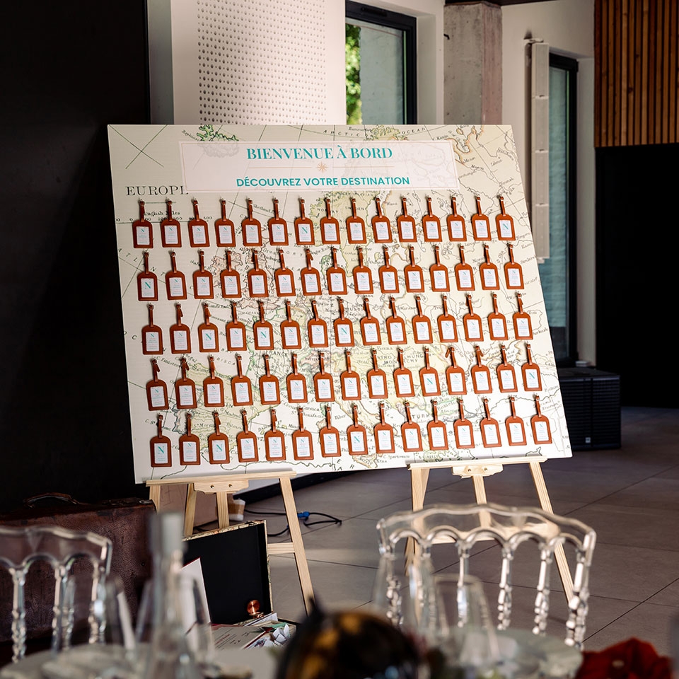 Nous avons parlé, entre autres choses, de leur passion pour les voyages, qui s’est naturellement imposée comme thème pour leur décoration de salle de mariage et Anthony, qui travaille dans les métiers de l’image et la communication, m’a montré ses inspirations créatives autour de ce thème. De quoi attiser ma curiosité sur la décoration qui promettait d’être élaborée avec soin et souci du détail.