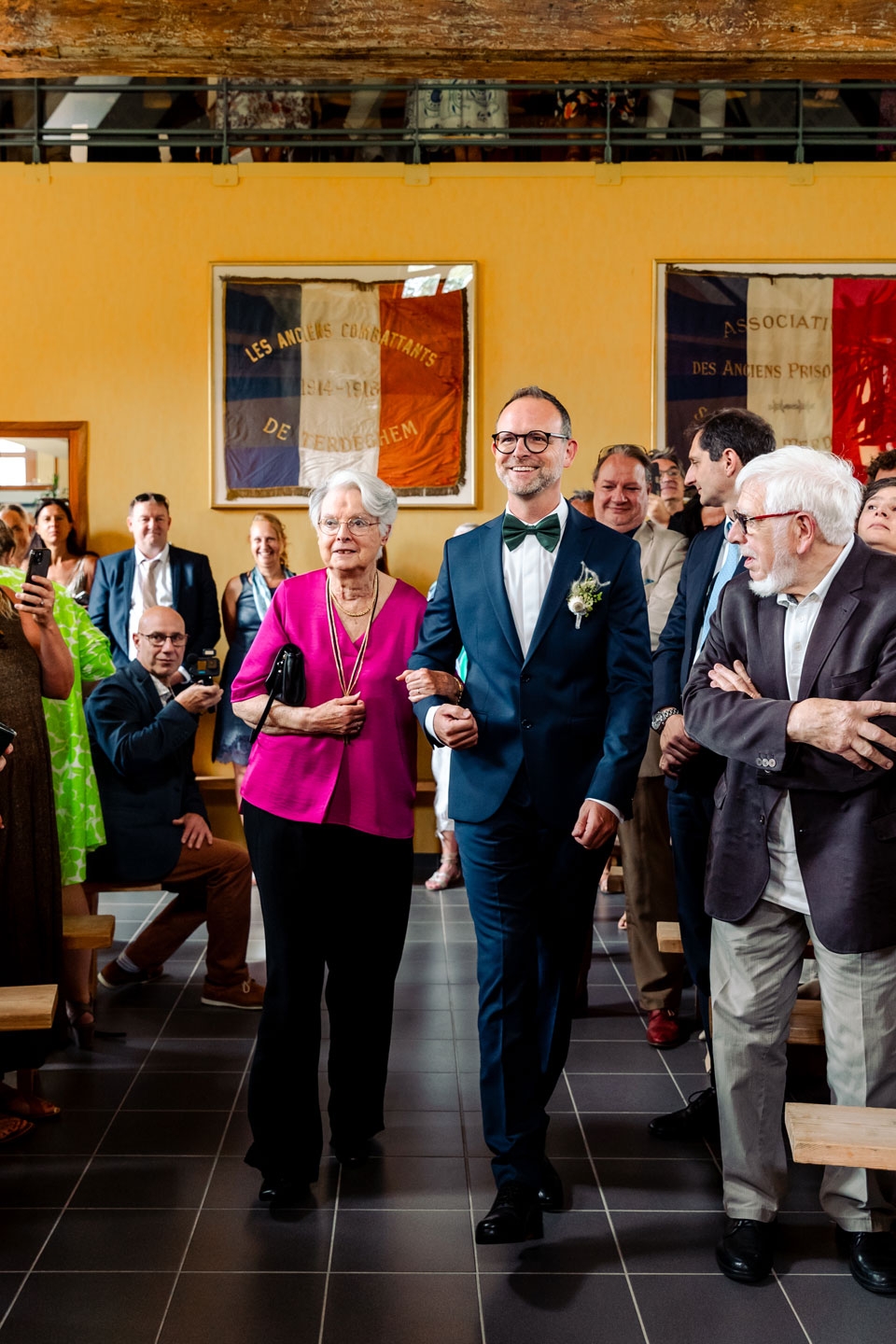 Le jour J, leurs amis musiciens et chanteurs ont rythmé les différents moments du mariage, à commencer par la mairie, avec talent et émotion. Lors de la séance couple dans les rues de Cassel, j’ai eu l’impression de photographier 2 mannequins tant les jeunes mariés étaient élégants, à l’aise et souriants. Moment fort du mariage, la cérémonie laïque, organisée en secret et célébrée à la tombée de la nuit, a surpris et touché l'ensemble des invités. Le fameux vivat flamand, tradition locale où les mariés se font arroser au champagne à travers un drap tendu au-dessus de leurs têtes, a clôturé cette magnifique cérémonie dans ambiance joyeuse et festive. Le repas, servi sur de grandes tablées, a parfaitement reflété la convivialité du Nord, où partage et chaleur humaine sont à l’honneur. Enfin, l’ambiance électrisante de la soirée a marqué tous les esprits. Portée par un duo exceptionnel, alliant un DJ percussionniste et un saxophoniste talentueux, la musique a enflammé la piste de danse. Une énergie contagieuse qui s'est répandue parmi les invités, créant des souvenirs vibrants et uniques.